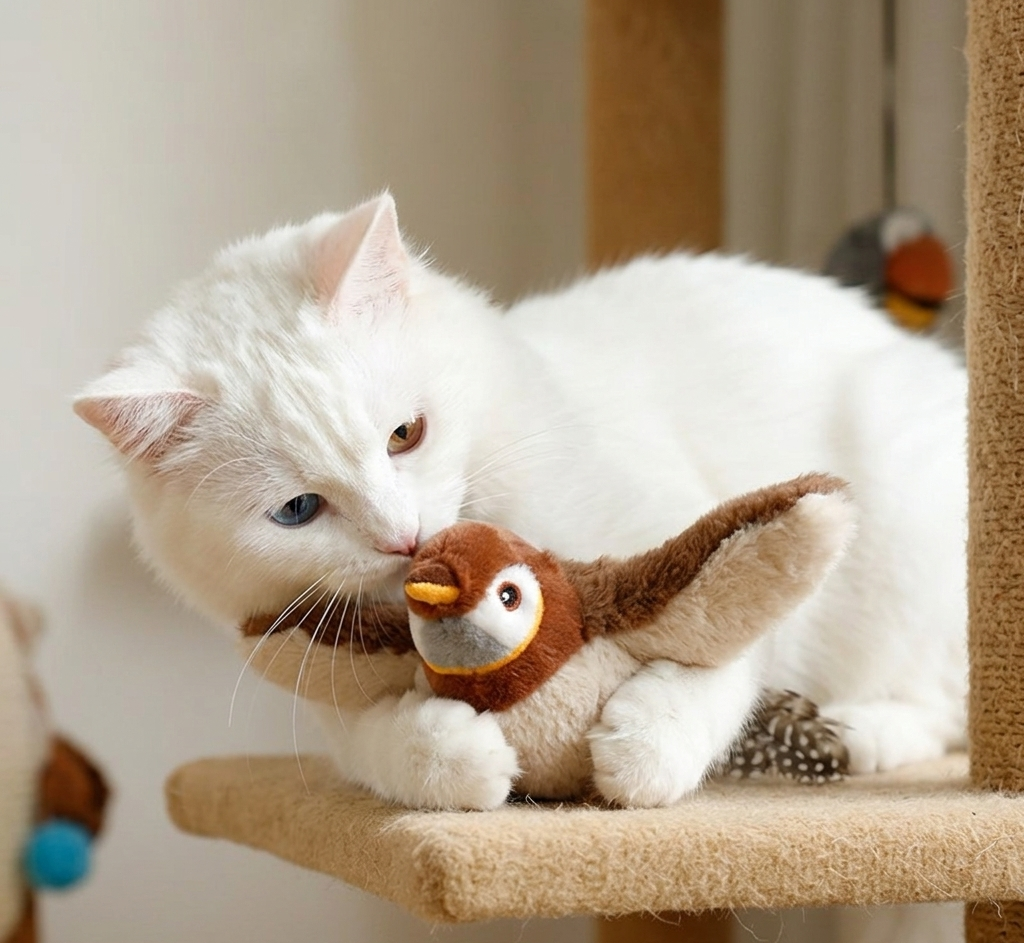 - Harekete Geçirin: Kuşu yere bırakın; akıllı sensörü sayesinde kediniz pati attığı an kanat çırpmaya ve cıvıldamaya başlasın!